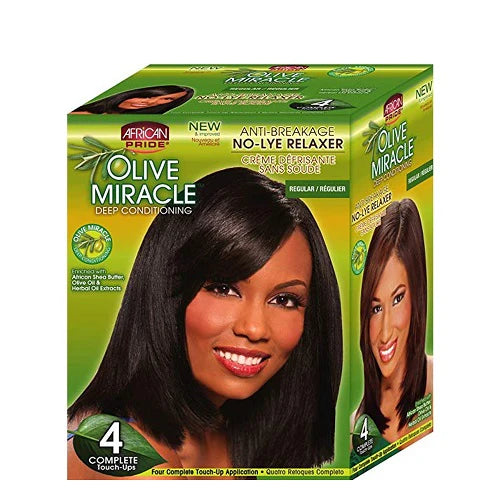 African Pride Olive Miracle Creme on Creme No Lye Relaxer Touch Up Kit is one complete touch up kit. All new African Pride Olive Miracle Creme on Creme No Lye Relaxer Touch Up Kit formula is enriched with Extra Virgin Olive Oil and Shea Butter for the ultimate in silky smooth straight hair from edges to ends. our unique StayFresh Creme-on-Creme formula makes touch ups quick, easy and mistake free. Say goodbye to the mixing errors and mess of liquid activators. And thanks to our StayFresh System, it stays fresh longer. Enjoy perfect straightening results every time with more conditioning and moisturizing in just 3 easy steps