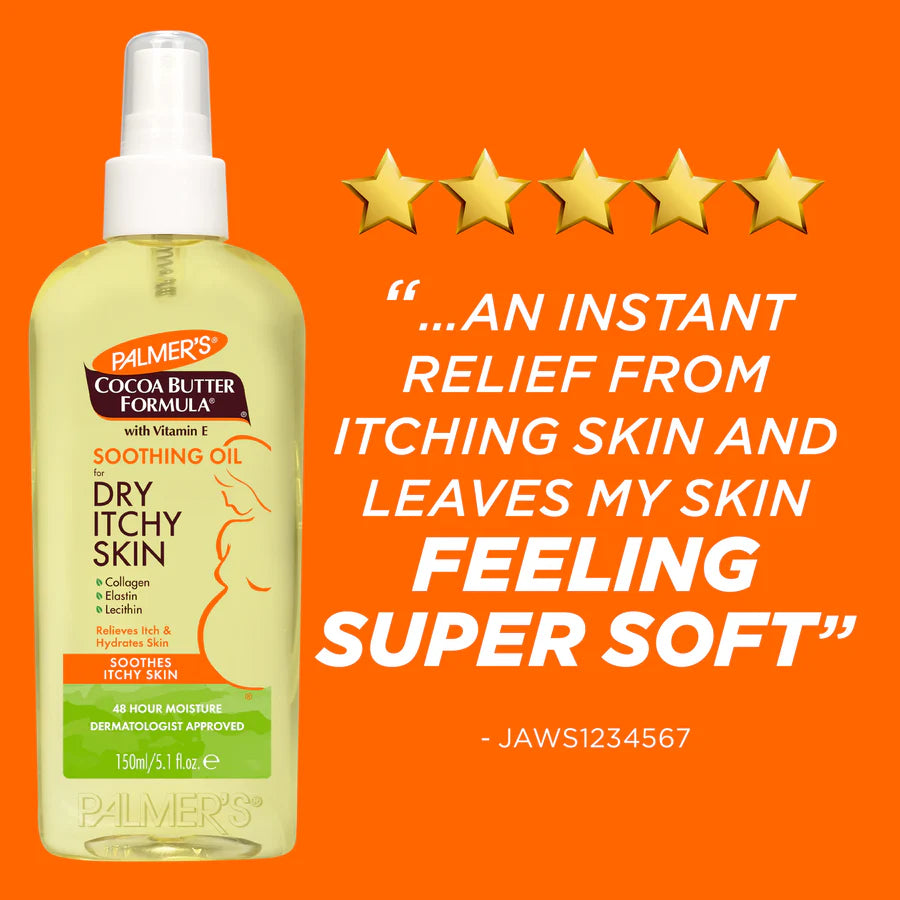 Palmer's Cocoa Butter Formula For Dry, Itchy Skin Soothing Oil is uniquely formulated to soothe, moisturize and soften the dry, itchy skin associated with pregnancy.